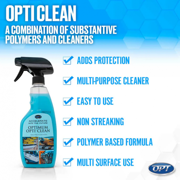 Optimum Opti-Clean is the most advanced waterless wash in the marketplace. It is designed to wipe away dirt and grime from automotive paint and other surfaces safely and effectively in a spray and wipe application. Optimum Opti-Clean contains the same proven polymer system that is used in the Optimum No Rinse Wash & Shine as well as additional polymers that add greater lubricity and protection to the paint. Simply spray Optimum Opti-Clean on any surface and wipe off with a plush microfiber towel till the area is clean and dry.